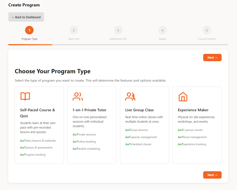 Create and manage group classes, 1-on-1 sessions, and self-paced courses all in one intuitive interface. Set your pricing, schedule, and curriculum with just a few clicks.